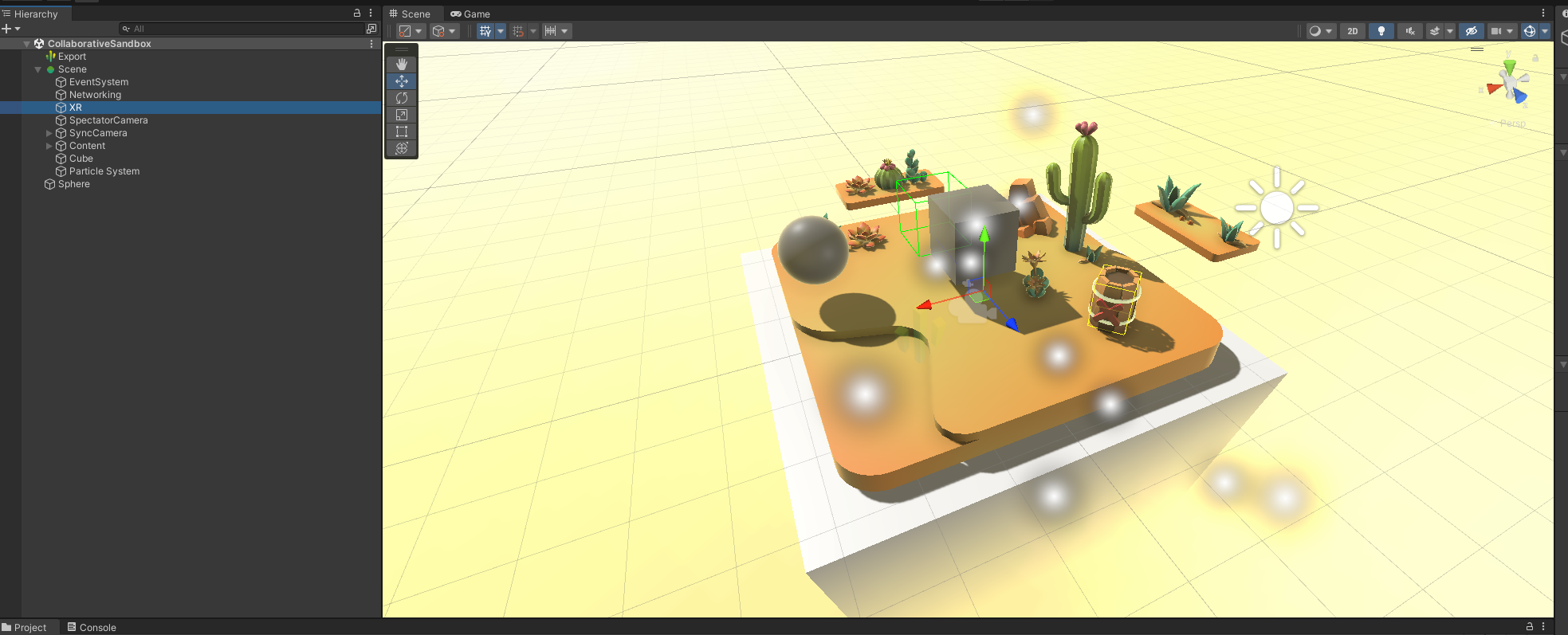 유니티 씬 안에 Needle 엔진에서 제공하는 Scene 오브젝트 내부에 추가한 오브젝트들이 하나의 GLTF 로 익스포트 되어, 웹에서 불러오는 방식.