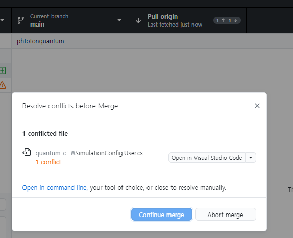 그리고 수정 사항을 받아야 하는 팀원은 Push 대신 Pull 이라고 나오고 몇개의 커밋블록이 있는지 출력 된다.