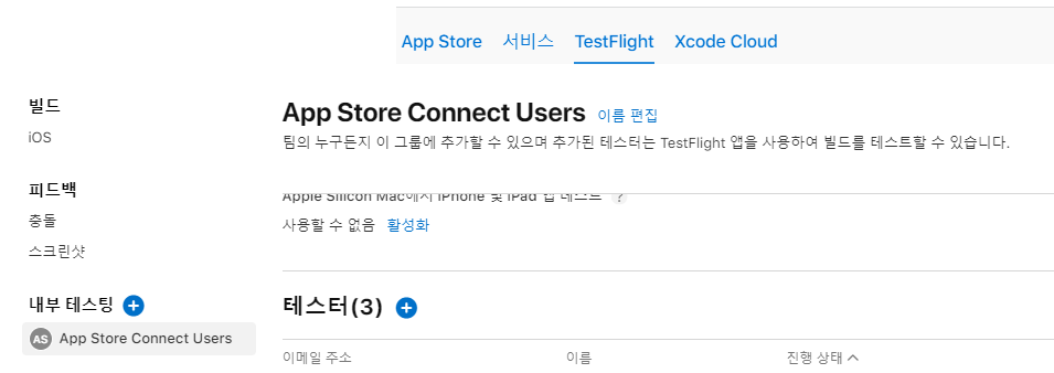 > 테스트 플라이트 메뉴로 와서 테스터 옆에 + 버튼 눌러서 추가 해 준다. 추가 한 대상에게 메일 수락 하게 한다